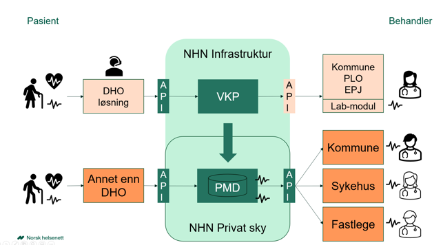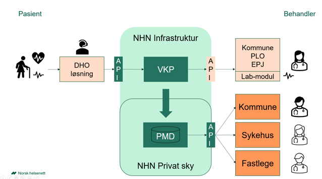 Ved å samle strukturert informasjon med bruk av VKP til ny tjeneste Pasientens måledata hos Norsk helsenett, vil måledata kunne deles med andre konsumenter via Måledata-API (PMD-API).